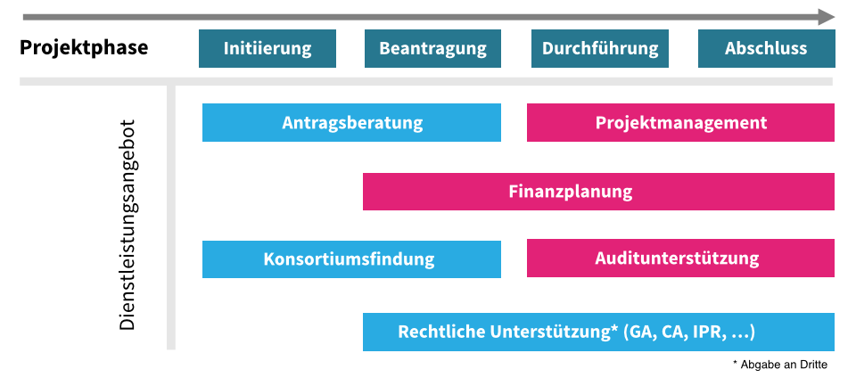 Unser Service umfasst alle Aktivitäten von der Projektinitiierung über die Beantragung und Durchführung bis hin zum Abschluss des Projektes.